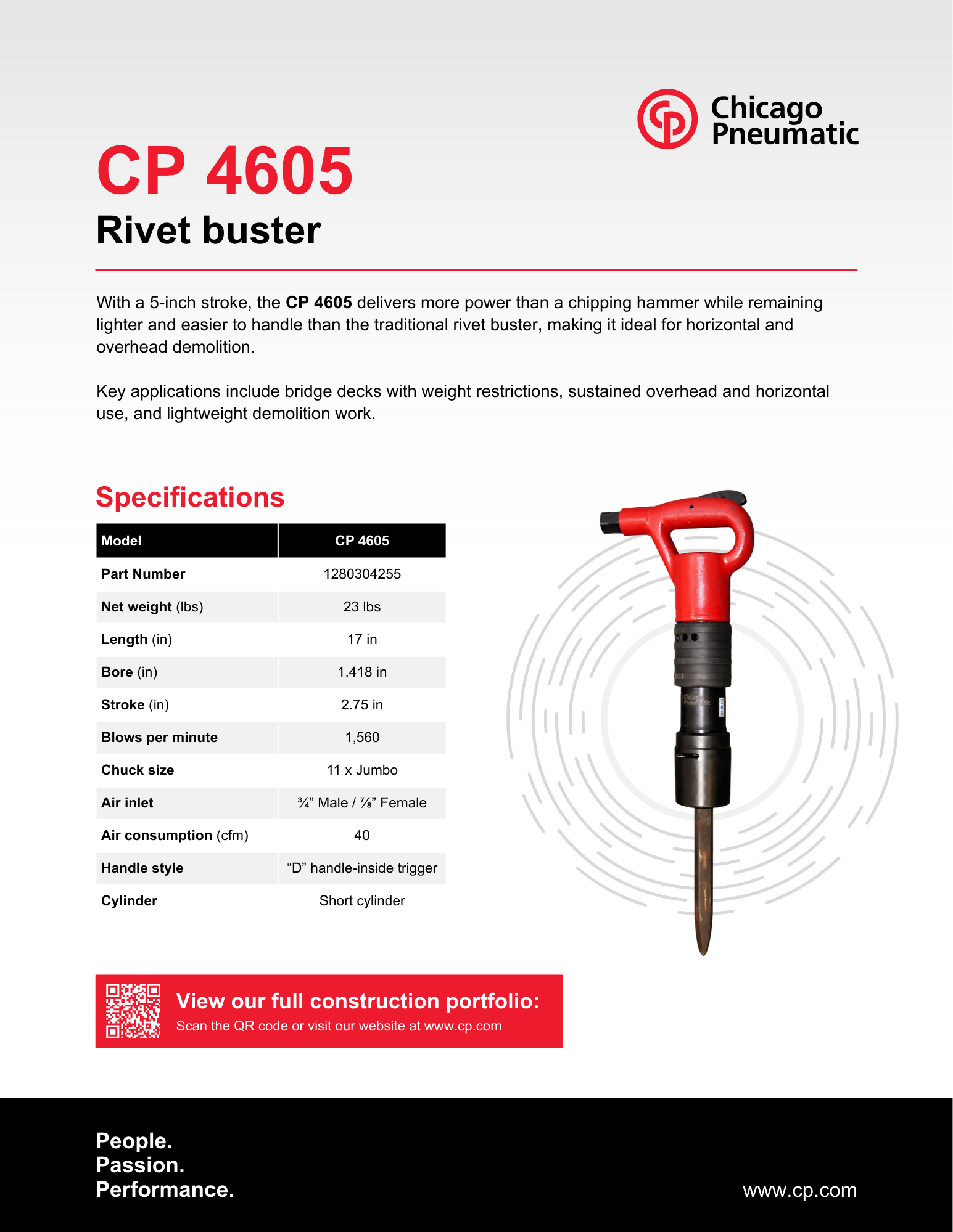 With a 5-inch stroke, the CP 4605 delivers more power than a chipping hammer while remaining lighter and easier to handle than the traditional rivet buster, making it ideal for horizontal and overhead demolition.