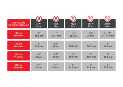 In ogni applicazione è importante poter utilizzare il livello di pressione corretto, in modo da rispettare gli standard di produttività. L'utilizzo di pressione e volume più alti in una tubazione di piccole dimensioni, provoca perdite per attrito e successivamente anche la perdita di pressione. Scegliere una tubazione delle giuste dimensioni che rispetti il volume dell'aria è un fattore fondamentale. Dai un'occhiata alla tabella riportata di seguito per effettuare la scelta giusta.