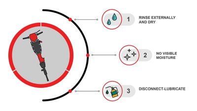 If the rock drill, breaker or hammer used for underwater work is going to be stored for more than a few hours after finishing the underwater work, the following should be carried out: